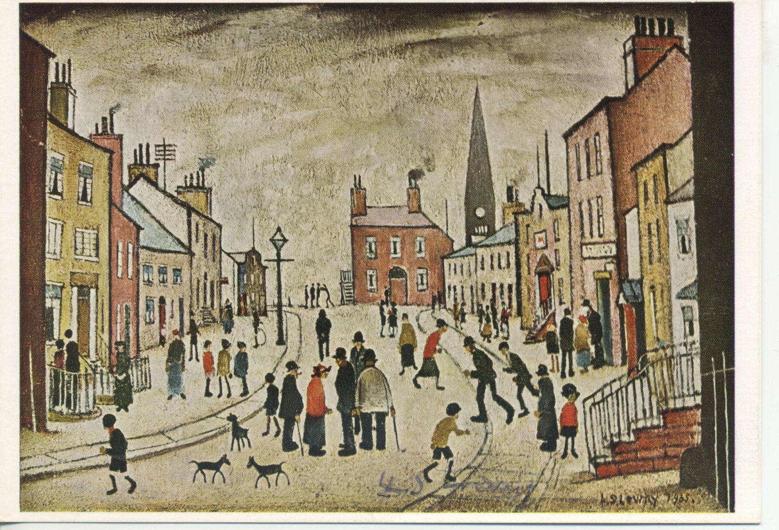 A LANCASHIRE VILLAGE SIGNED POSTCARD BY LS LOWRY